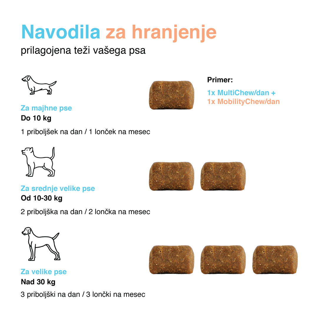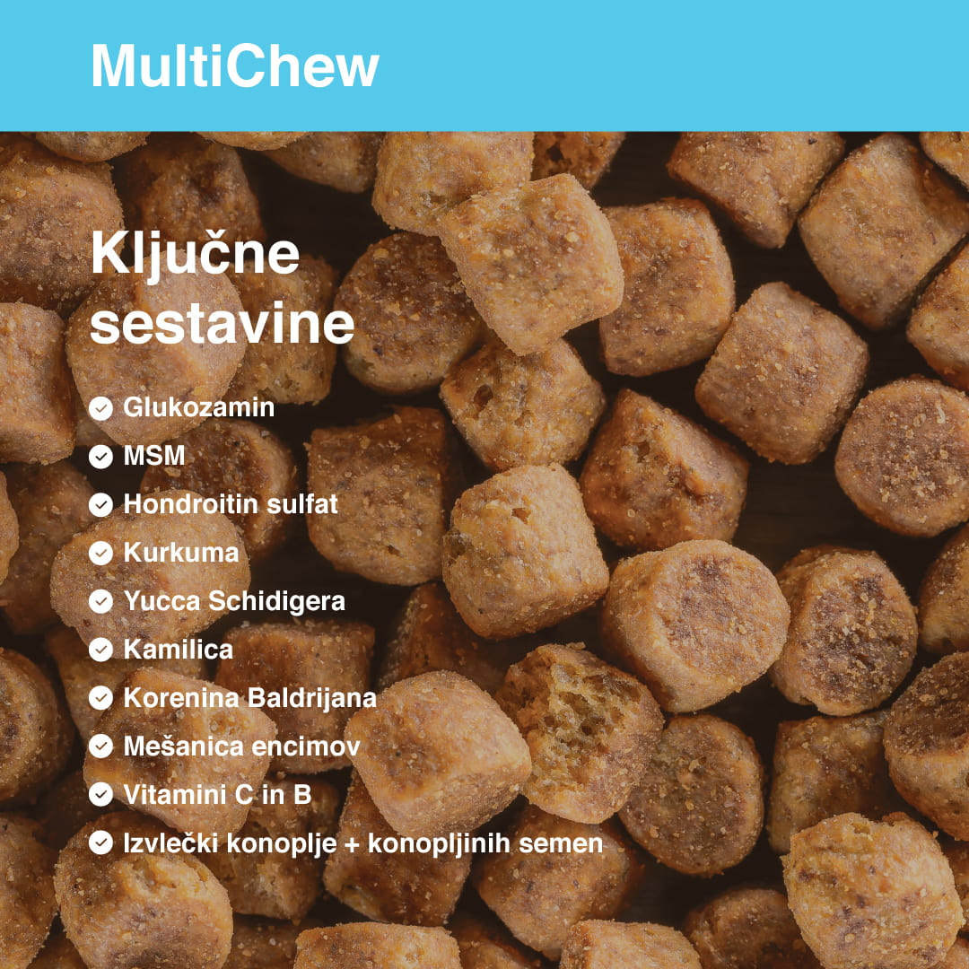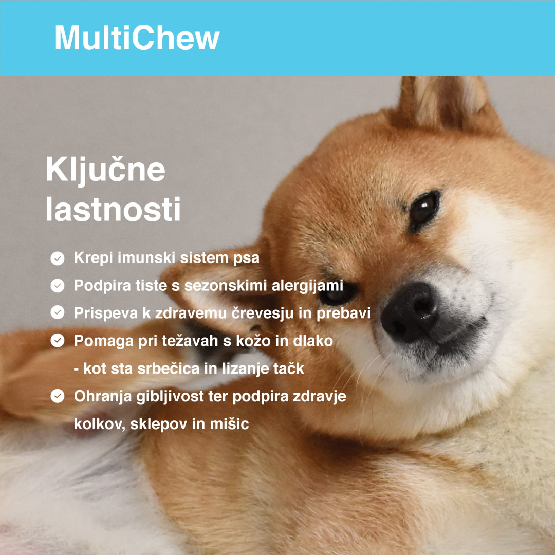 Multi Chew je zasnovan tako, da v enem priboljšku podpira imunski sistem, zdravje kože in dlake ter sklepe — naravno in brez umetnih dodatkov.