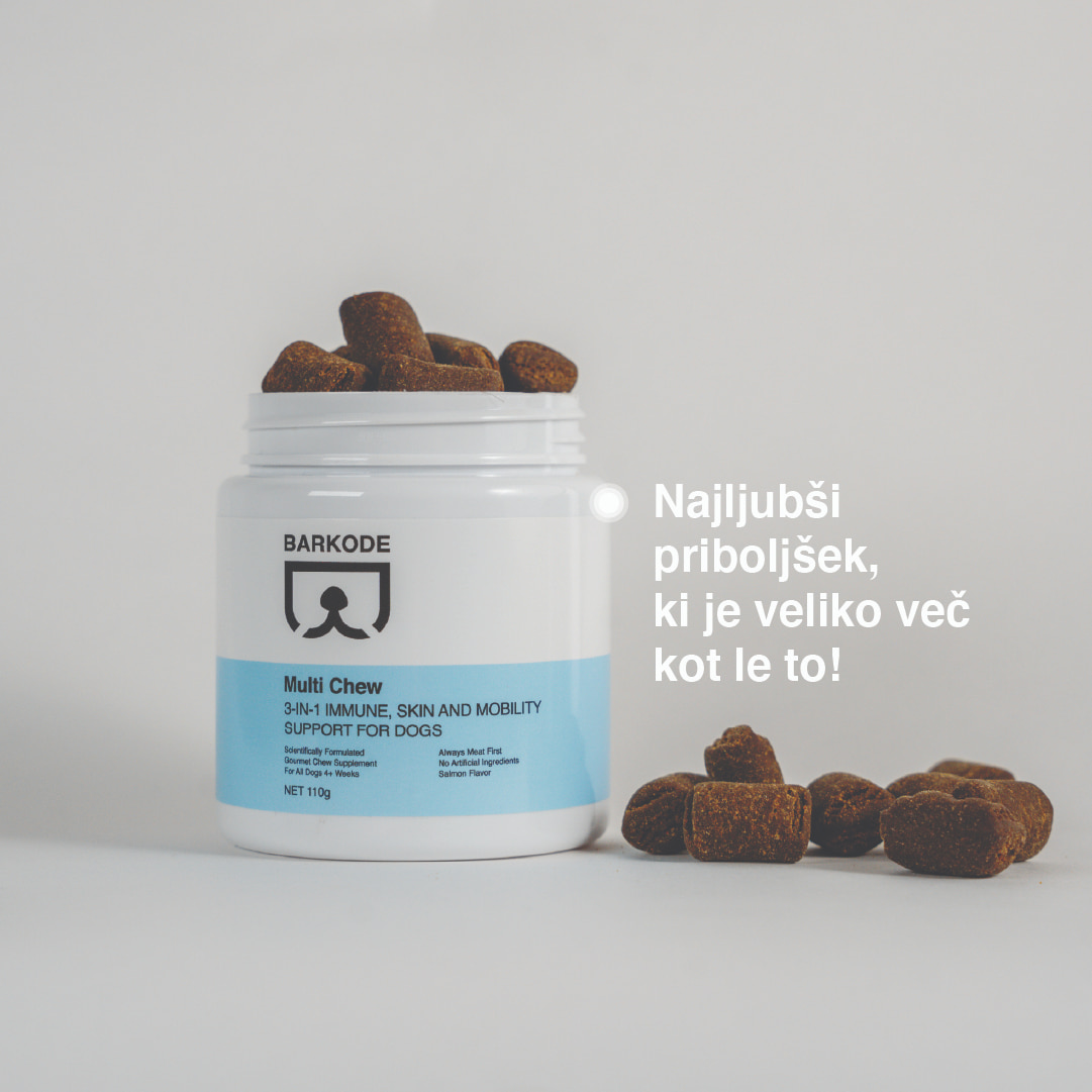 Complete 5-in-1 support for immunity, skin, coat, joints, and digestion — in a natural daily chew your dog will love.