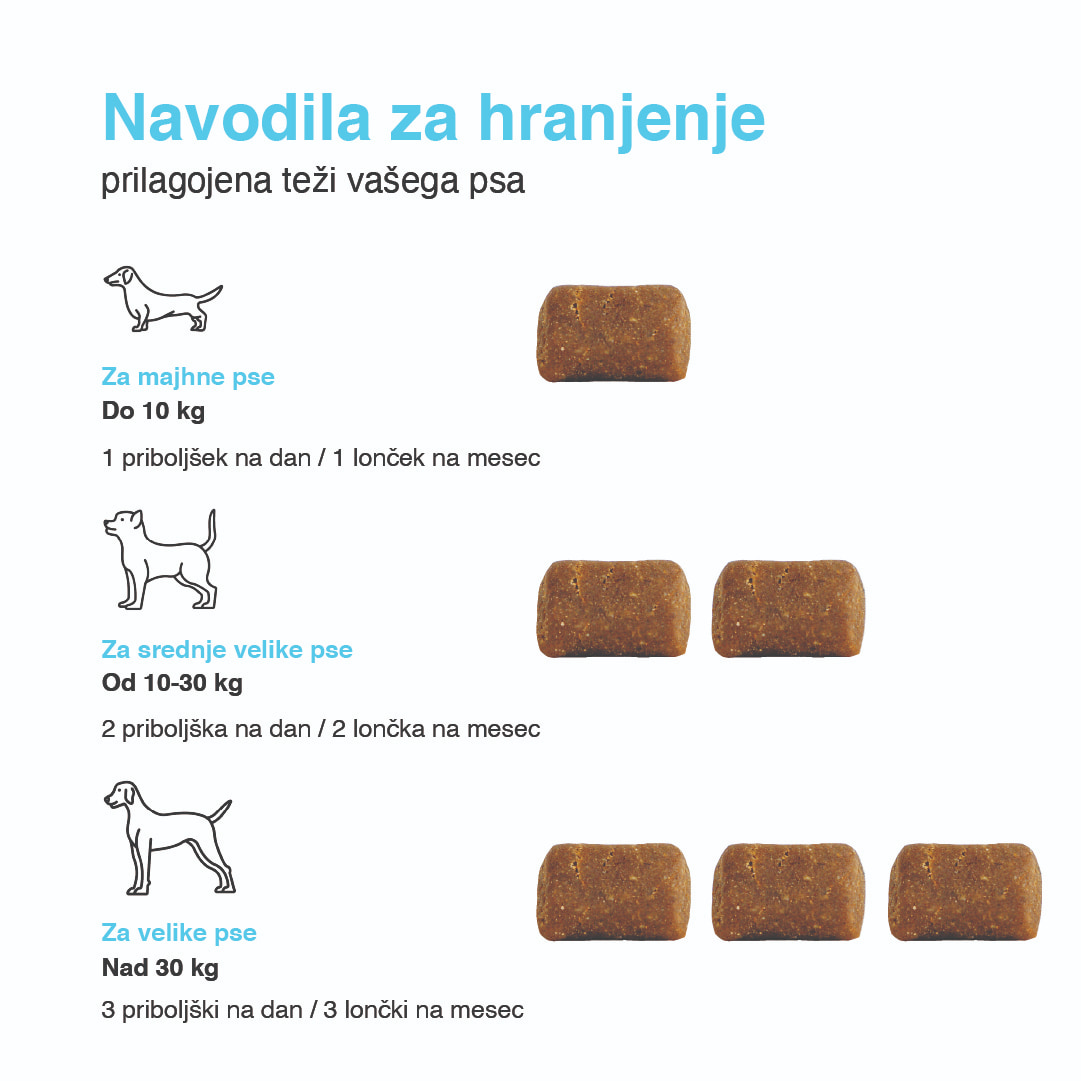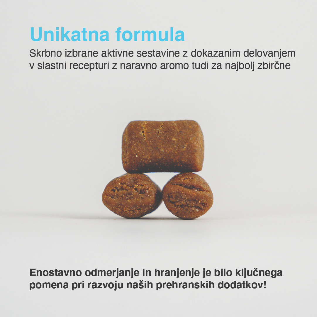 Easy dosing and feeding were central to developing our supplements. Each chew contains the ideal ratio of ingredients for dogs up to 10 kg. For larger dogs, simply increase the number of chews: