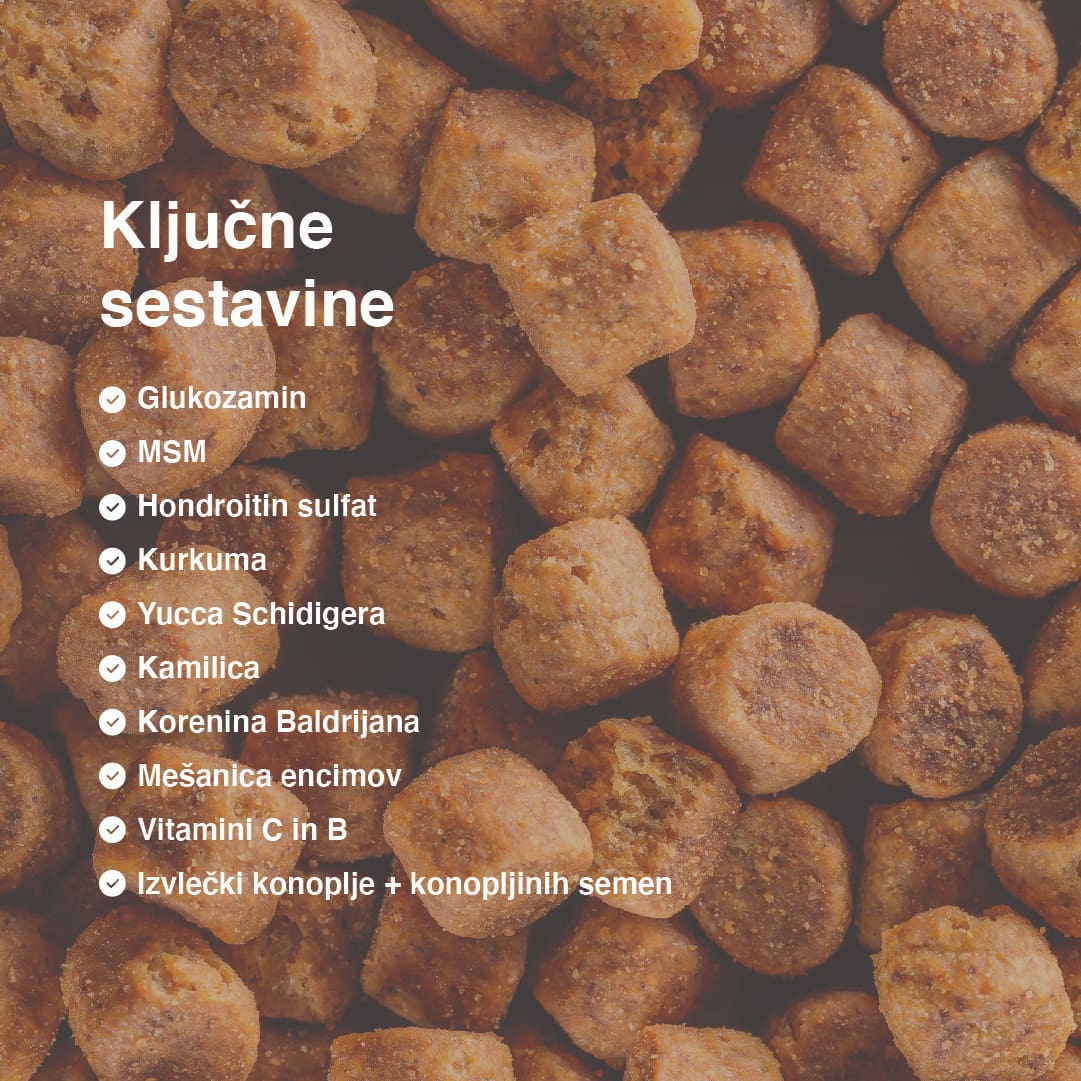 Fish meal, potato starch, glycerin, potato flour, potato fibre, chicory root powder (5.3%), pea flour, glucosamine (4.5%), hydrolysed collagen (4.5%), fish oil (3%), algal meal (hydrolysed), hemp oil (2%), Sophora japonica, methylsulfonylmethane (MSM) (1.5%), green-lipped mussel (1.5%), carrot, sodium tripolyphosphate, colostrum (0.75%), vegetable oils and fats (evening primrose oil) (0.5%), maltodextrin, inactivated Lactobacillus helveticus HA-122. Vitamins (A, B-complex, C, D3, E) + Colostrum Support the immune system, energy metabolism, and cell protection against oxidative stress — contributing to resilience and overall vitality. Glucosamine + Collagen + MSM + Green-lipped mussel Key ingredients for joint, cartilage, and connective tissue health, helping maintain flexibility and comfortable movement. Omega-3 + Omega-6 fatty acids (fish oil + plant oils) Support healthy skin, a shiny coat, and balanced inflammatory processes in the body. Prebiotic fibres (chicory) + Microbial cultures (Bacillus velezensis) Together they support a balanced gut microbiota, healthy digestion, better nutrient absorption, and stable gut function.